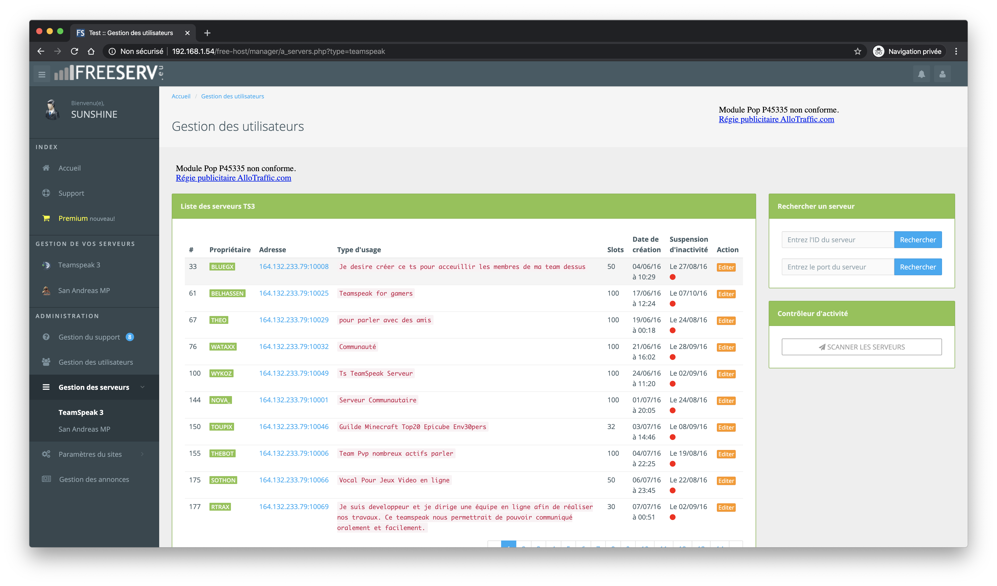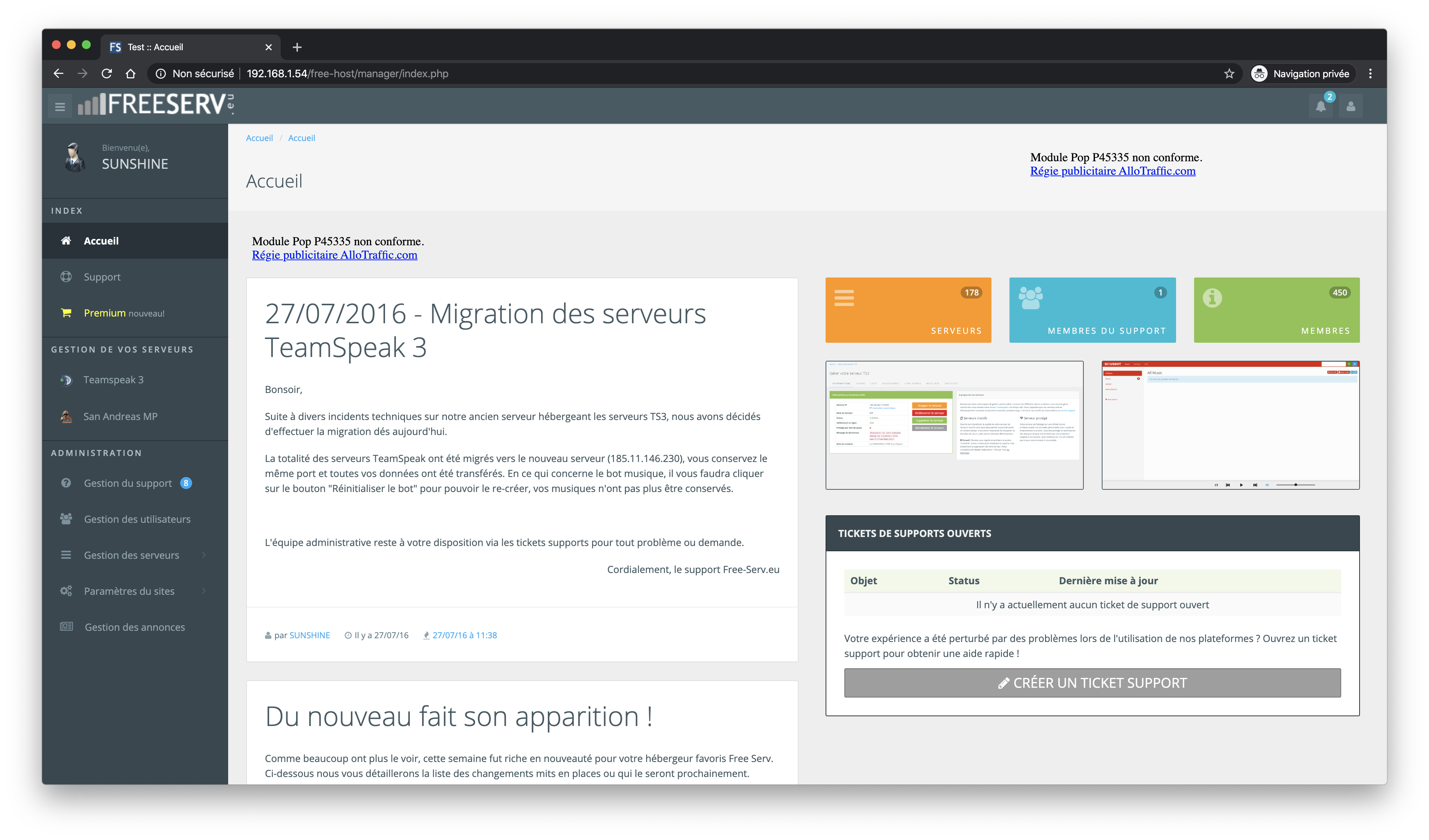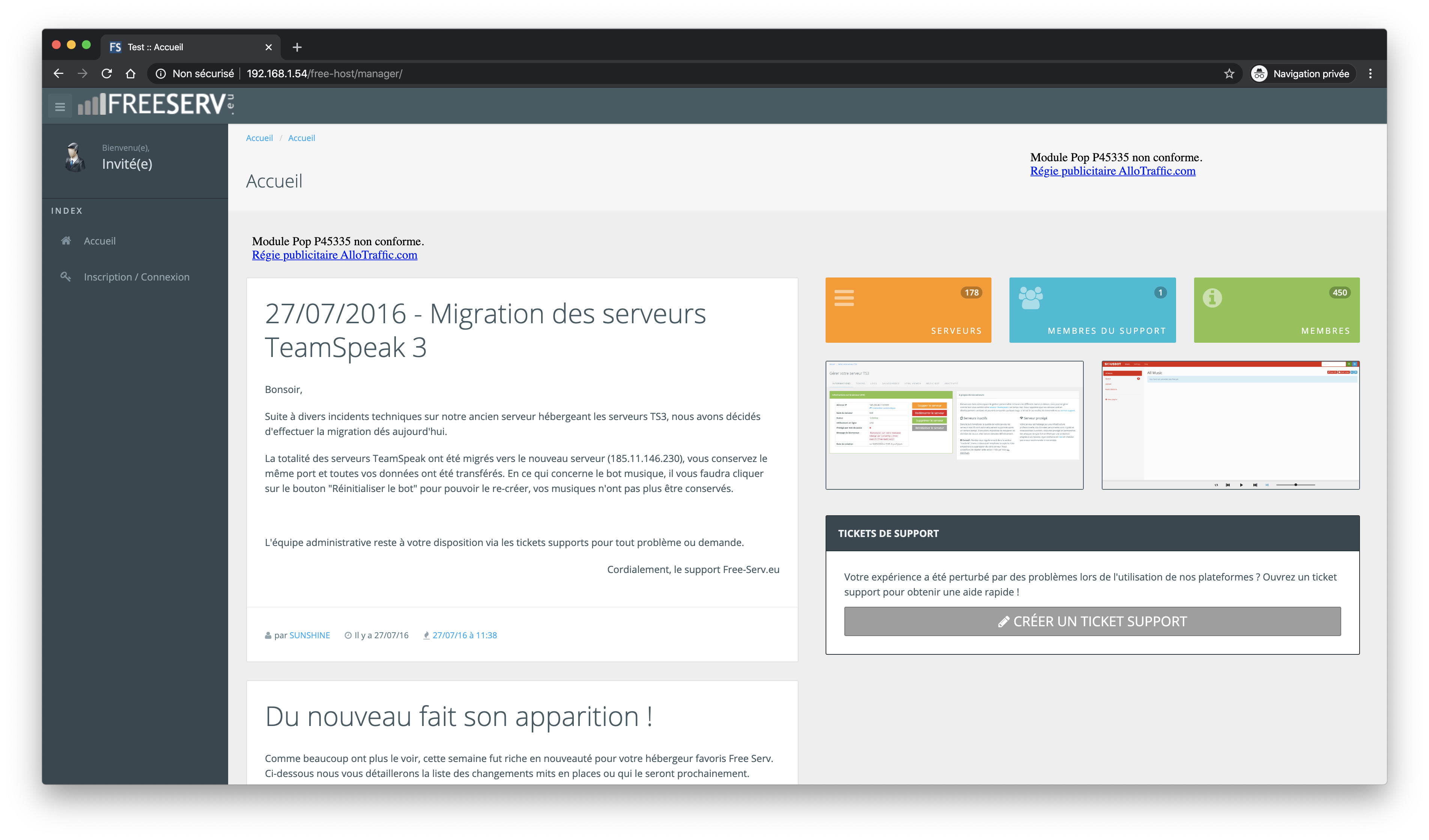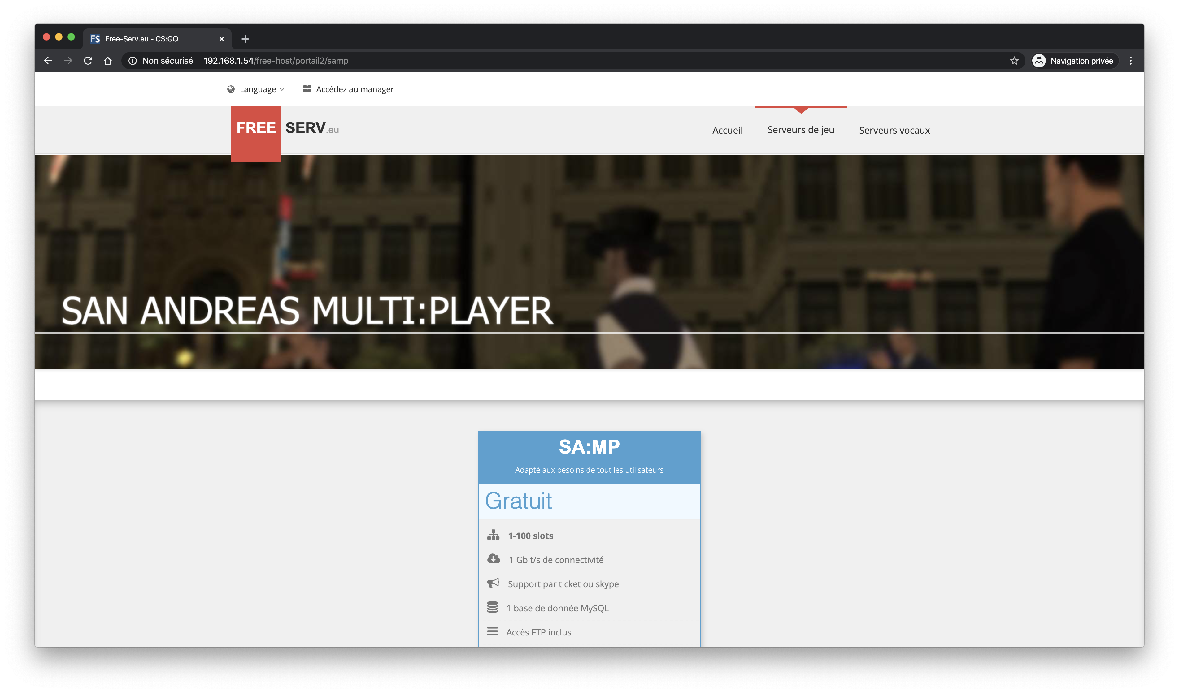 Site internet d'hébergement de serveurs de jeux et vocaux. Ce site permet de créer des serveurs et les administrer. Il embarque une partie administrative complète pour permettre aux administrateurs de gérer les serveurs et utilisateurs hebergés sur l'infrastructure.